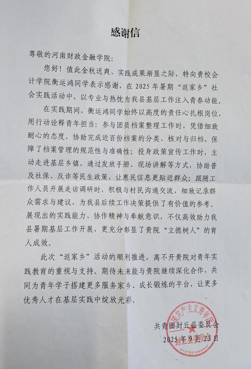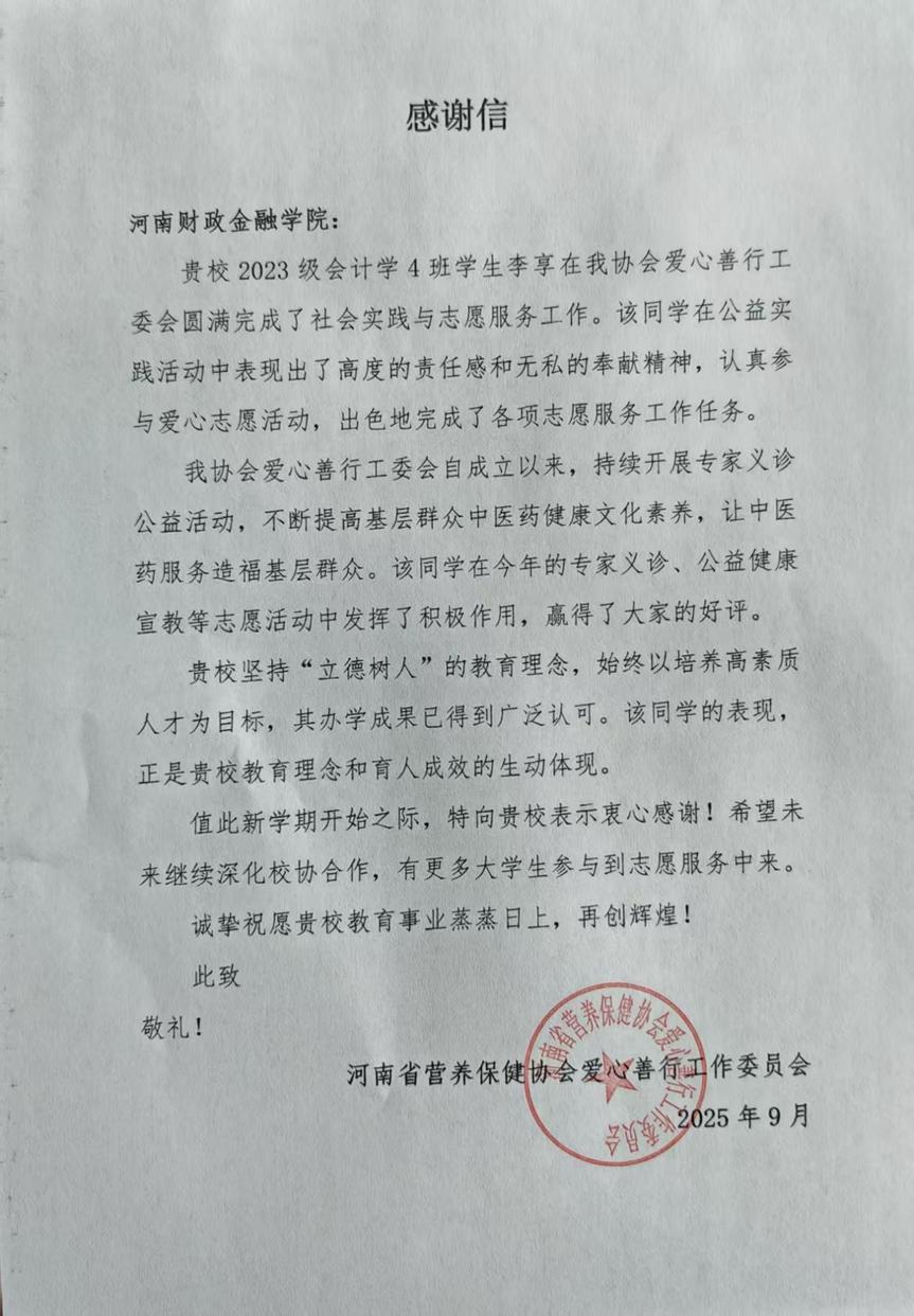 近日,会计学院收到共青团封丘县委员会和河南省营养保健协会爱心善行工作委员会发来的感谢信。信中对2023级会计学3班学生衡运鸿在2025年“返家乡”暑假社会实践活动中、2023级会计学4班学生李享在省营养保健协会公益爱心活动中的优异表现予以高度肯定,同时向学校长期坚持“立德树人”根本任务、培养兼具专业能力与社会责任感的优秀青年学子,表达了诚挚感谢。