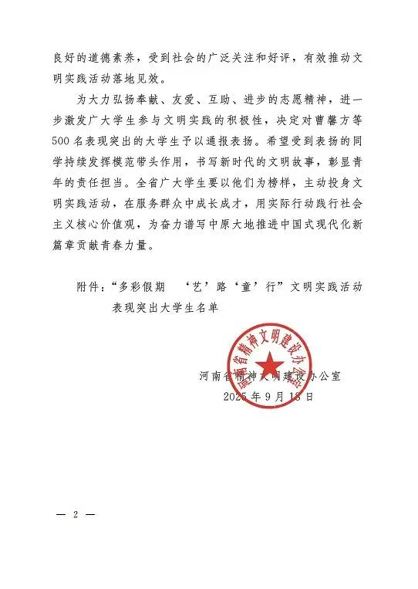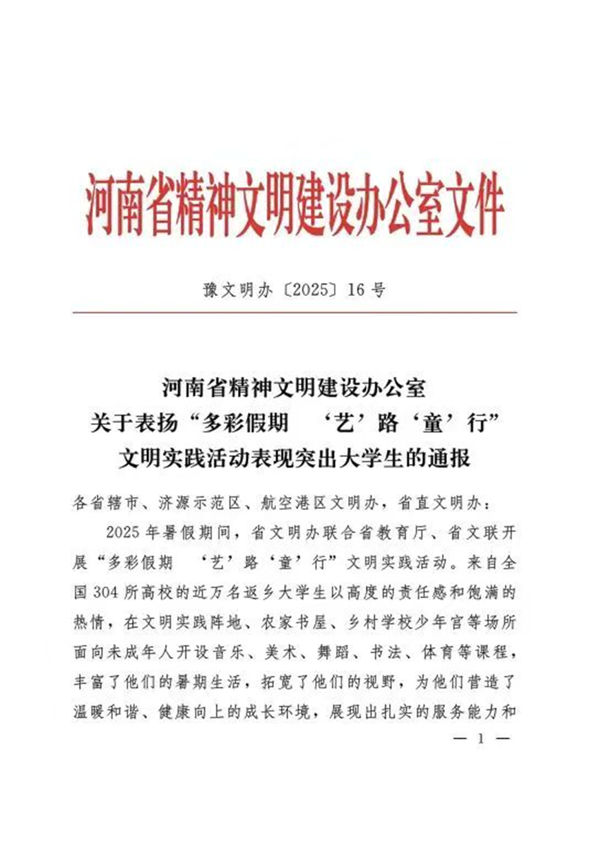 近日,河南省精神文明建设办公室印发《关于表扬“多彩假期 ‘艺’路‘童’行”文明实践活动表现突出大学生的通报》(豫文明办〔2025〕16号),对在全省暑期文明实践活动中表现优异的500名大学生予以通报表扬。会计学院2023级会计学U(3)班杨牧远同学名列其中,展现出我院学子良好的精神风貌和扎实的志愿服务能力。